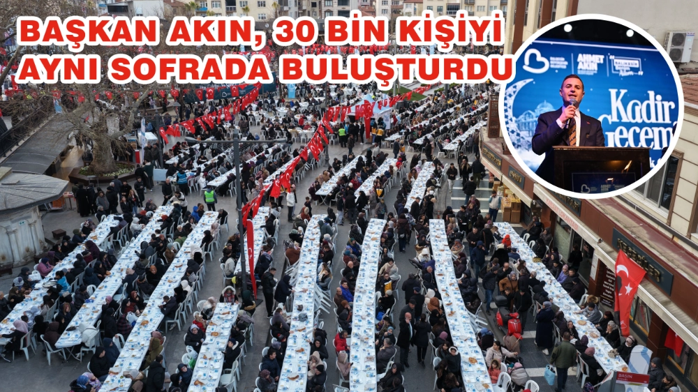 Balıkesir Büyükşehir Belediye Başkanı Ahmet Akın, Kadir Gecesi’nde Zağnos Paşa Cami Meydanı’nda kurulan dev iftar sofrasında 30 binden fazla hemşehrisiyle aynı ekmeği bölüştü. Geniş bir katılımla gerçekleşen iftar programında birlik ve beraberlik mesajı veren Akın, “Ramazan Bayramı sabahına yaklaşırken; kalbimde tek bir dilek var: Birbirimizi anlamaktan, birbirimizin elini tutmaktan, farklılıklarımızda zenginlik bulmaktan, birbirimize yakın olmaktan hiç vazgeçmeyelim.” dedi.