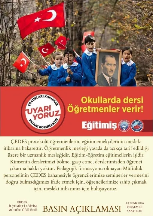 Eğitim-İş Erdek Temsilciliği, Millî Eğitim Bakanlığı’nın ÇEDES uygulamasına tepki göstermek amacıyla 8 Ocak 2026 Perşembe günü, saat 13.00’te, İlçe Millî Eğitim Müdürlüğü önünde basın açıklaması yapacak.