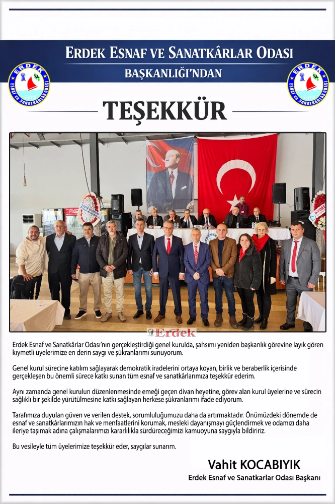 Erdek Esnaf ve Sanatkârlar Odası’nın gerçekleştirdiği genel kurulda, şahsımı yeniden başkanlık görevine layık gören kıymetli üyelerimize en derin saygı ve şükranlarımı sunuyorum.