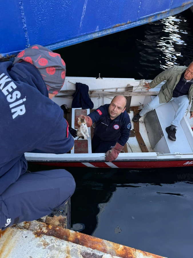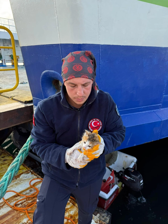 Erdek Limanı’nda denize düşen yavru kedi, itfaiye ve Sahil Güvenlik ekiplerinin hızlı ve dikkatli müdahalesiyle kurtarıldı.
