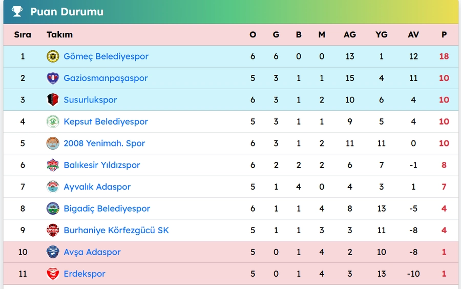 Buna göre Erdekspor 1 puanla ligin son sırasında yer alırken, Gömeç Belediyespor ise 18 puanla ligin 1.'nci sırasında yer aldı.