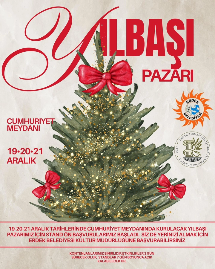 “19-20-21 Aralık 2025 tarihlerinde düzenleyeceğimiz yılbaşı pazarımız için stant ön başvurularımız başlamıştır. Yeni yıl coşkusunu birlikte yaşayacağımız, çeşitli etkinliklerin, DJ performanslarının gerçekleşeceği coşkulu açılışımız ile başlayacak yeni yıl pazarında siz de yerinizi almak, ürünlerinizi Erdek halkıyla buluşturmak isterseniz, Erdek Belediyesi Kültür Müdürlüğü’ne başvurabilirsiniz.