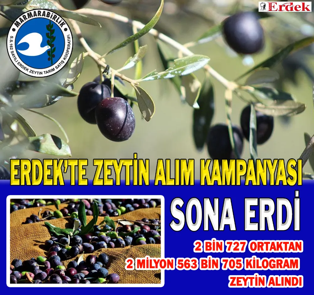 Marmarabirlik’e bağlı Erdek Zeytin Tarım Satış Kooperatifi tarafından 27 Ekim 2025 Pazartesi günü başlatılan 2025/2026 zeytin alım kampanyası, 14 Aralık 2025 Pazar günü itibarıyla tamamlandı.