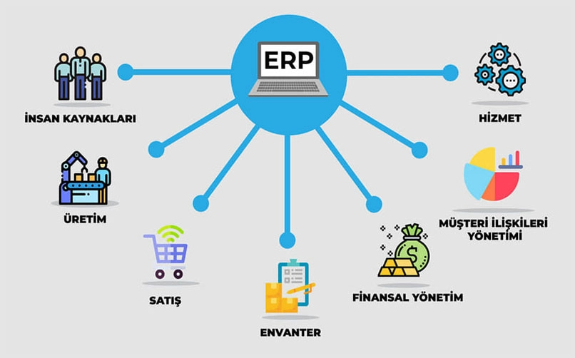ERP (Enterprise Resource Planning - Kurumsal Kaynak Planlama) programı, işletmenin tüm departmanlarını ve iş süreçlerini tek bir entegre yazılım üzerinde bir araya getiren kapsamlı yönetim çözümleridir. Muhasebe, satış, satın alma, stok, üretim, insan kaynakları ve müşteri ilişkileri gibi birbirinden bağımsız modüller, ERP programı sayesinde birbiriyle kesintisiz iletişim kurar.