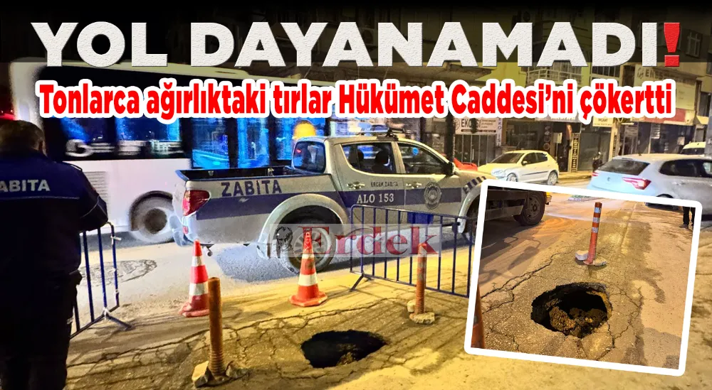 Erdek Hükümet Caddesi’nde yolun bir bölümü çöktü. Liman güzergâhı olan caddeden tonlarca ağırlıktaki tırların geçmesi sonucu meydana geldiği değerlendirilen çökme, tehlikeyi bir kez daha gözler önüne serdi.