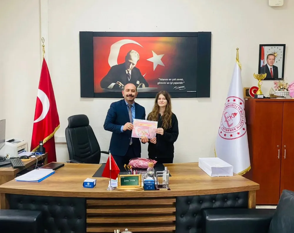 Öğrenciye başarı belgesi ve çeşitli hediyeler takdim eden Turan, Türkiye genelinde açıklanacak sonuçların heyecanla beklendiğini ifade etti.