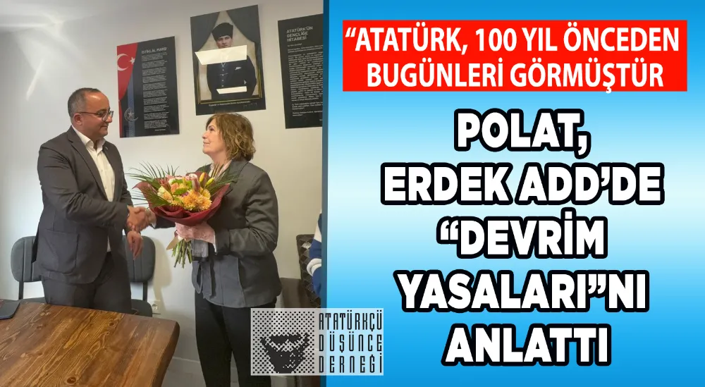 ADD Erdek Şube Başkanı Ayten Özokan’ın moderatörlüğünde gerçekleşen toplantıda konuşan Av. Polat, Türkiye Cumhuriyeti’nin, Atatürk’ün yaşama geçirdiği laik, demokratik, sosyal bir hukuk devleti olduğuna vurgu yaparak başladığı konuşmasını şöyle sürdürdü: