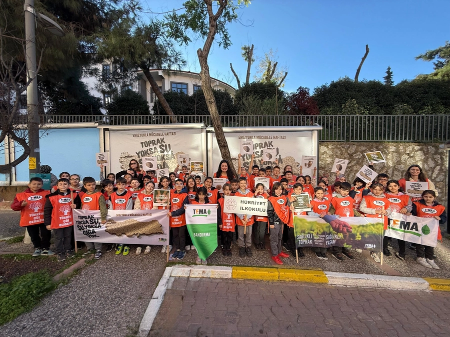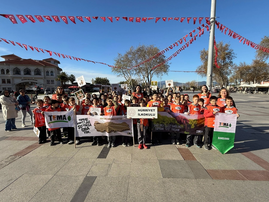 17-30 Kasım ‘Erozyonla Mücadele Haftası’ etkinlikleri kapsamında, 25 Kasım 2025 tarihinde, TEMA Vakfı Bandırma İlçe Sorumluluğu öncülüğünde , Bandırma Hürriyet İlkokulu 4. sınıf öğrencileri, anlamlı bir farkındalık yürüyüşü gerçekleştirdiler. Minik TEMA gönüllüleri, ‘Toprak yoksa su, su yoksa gıdı yok’ temasıyla okul binalarından başlayarak kentin kalbi Cumhuriyet meydanına kadar yürüdüler. Yürüyüş boyunca, güzergâh üzerindeki vatandaşlara ve esnaflara el broşürleri dağıtılarak, erozyonun küresel boyutları ve yerel etkileri hakkında bilgilendirme yapıldı. Etkinlik, Bandırma halkının konuya ilgisini artırarak, toprağa sahip çıkma bilincinin yayılmasına önemli katkı sağladı.”
