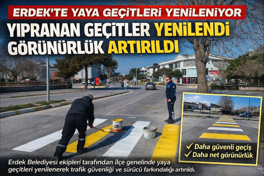 Erdek Belediyesi ekipleri, ilçe genelinde yaya güvenliğini artırmak amacıyla yaya geçitlerinde yenileme çalışmalarını sürdürüyor.