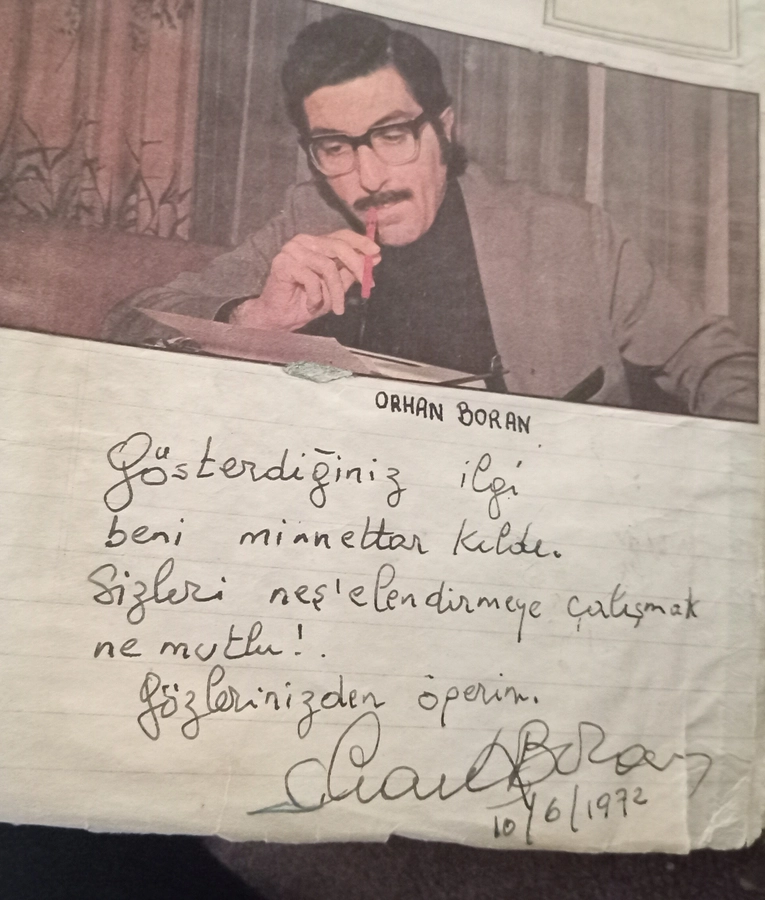 Usta sunucu Orhan Boran, 10 Haziran 1972’de, yaz ayında kaldığı Erdek’teki “Gül Plaj” Oteli’nde geçirdiği bir bunalım sonucunda çok sayıda hap içerek intihar girişiminde bulunmuştu. O yıl, Bandırma Şehit Mehmet Günenç Lisesi’nin son sınıfında öğrenciydim. Orhan Boran, intihar girişiminin ardından, Bandırma Sosyal Sigortalar Kurumu(SSK) Hastanesi’nde tedavi altına alınmıştı. Tabii ki kendisini ziyaret ederek, “geçmiş olsun” demiştim. Bu arada, yanımda götürdüğüm, onunla ilgili haber ve röportajlardan hazırladığım defteri de götürmüştüm. Dikkatle incelemiş ve çok beğendiğini söyleyerek, defterime, “Gösterdiğiniz ilgi beni minnettar kıldı. Sizleri neşelendirmek ne mutlu!” yazarak, imzalamıştı.